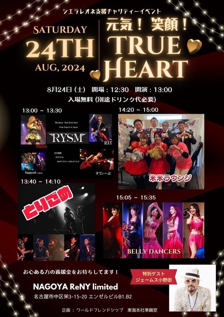 2024年07月14日 8月RYSMライブ NAGOYA ReNY limited 8月RYSMライブ 2024年8月24日(土) 会場:NAGOYA ReNY limited 愛知県名古屋市中区栄3-15-20 エンゼルビルB1・B2 開場:12:30 出演:13:00 シエラレオネ人道支援チャリティーイベントに出演 入場無料(ドリンク代別)